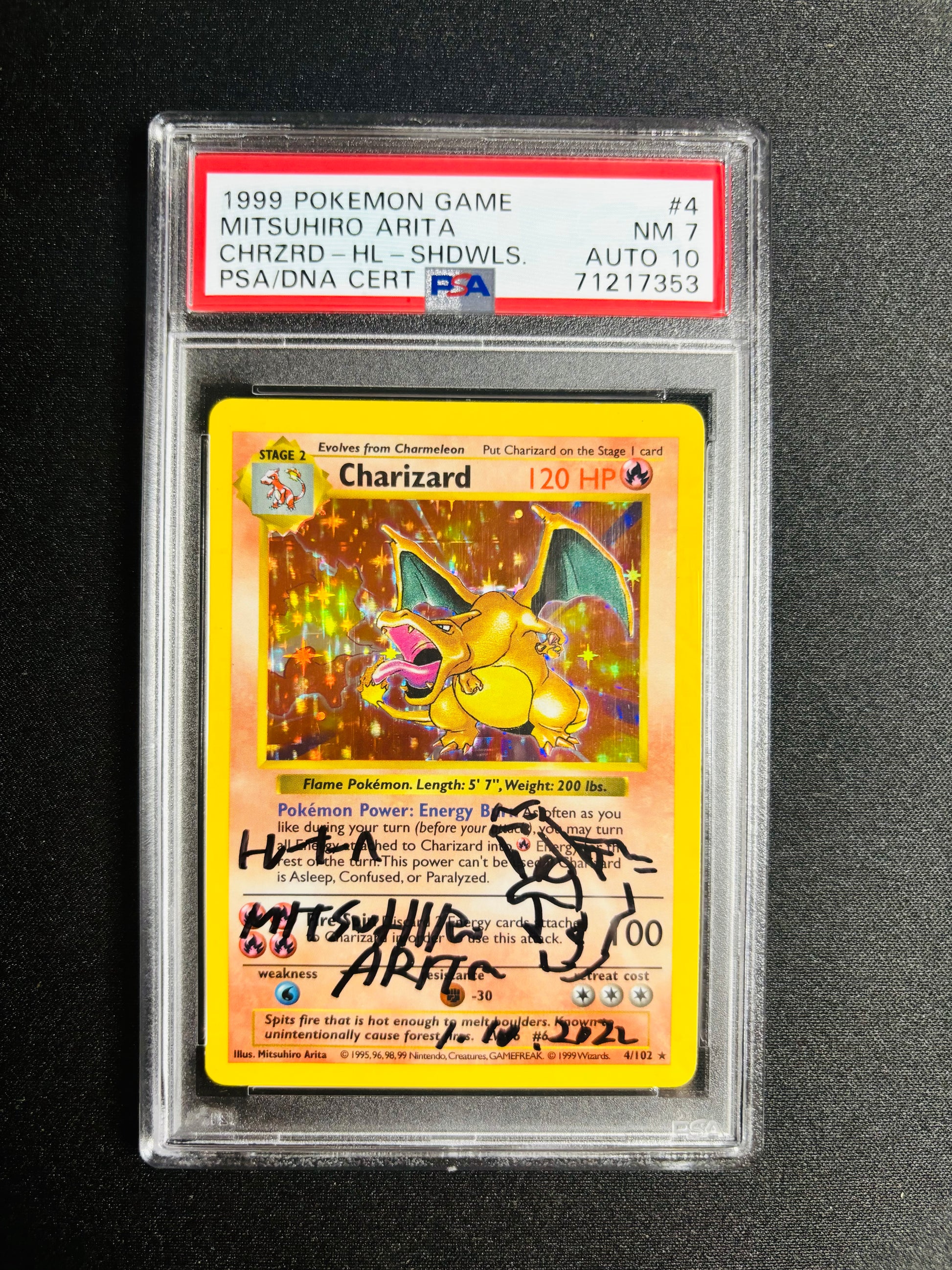 1999 POKEMON GAME MITSUHIRO ARITA CHARIZARD SHADOWLESS PSA 7/10